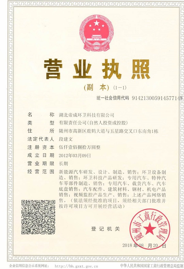 • 湖北帝成環(huán)衛(wèi)科技有限公司座落在中國專用汽車之都湖北隨州。隨州是歷史文化古城,炎帝神農(nóng)故里,編鐘古樂之鄉(xiāng),專用汽車之都。我司專業(yè)生產(chǎn)銷售各種垃圾車,包括勾臂式垃圾車、壓縮式垃圾車、新能源垃圾車、純電動垃圾車;吸糞車,吸污車,灑水車,高壓清洗車,清洗吸污車,污水處理車,霧炮車等各種環(huán)衛(wèi)車;道路清障車,平板運輸車,隨車起重運輸車,高空作業(yè)車,散裝飼料車,LED廣告車,水泥攪拌車,粉粒物料運輸車,客車校車等各種專用特種汽車。我司產(chǎn)品質(zhì)量可靠,技術(shù)先進,價格低廉,性價比和競爭力領(lǐng)先。愿隨時為您提供各種專用車咨詢和報價!歡迎隨時聯(lián)系垂詢!
