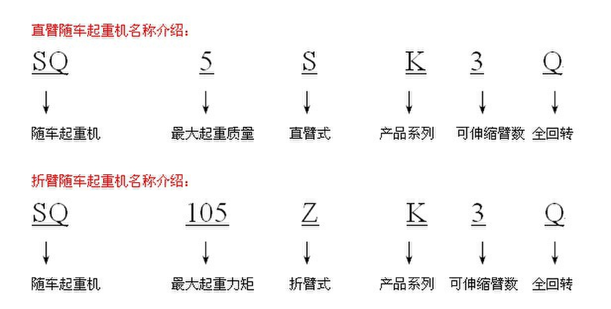 徐工隨車吊的代碼由6個部分組成。又分為折臂吊和直臂吊。常見的命名方式為SQ105ZK3Q或者SQ5SK3Q這種。那么這中代碼中每個位置分別代表什么意思呢?請看下表。