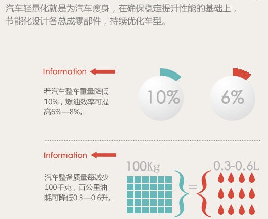 汽車輕量化就是為汽車瘦身,在確保穩(wěn)定提升性能的基礎(chǔ)上,節(jié)能化設(shè)計(jì)各總成零部件,持續(xù)優(yōu)化車型。實(shí)驗(yàn)證明,若汽車整車重量降低10%,燃油效率可提高6%—8%;汽車重量降低1%,油耗可降低0.7%;汽車整備質(zhì)量每減少100千克,百公里油耗可降低0.3—0.6升。