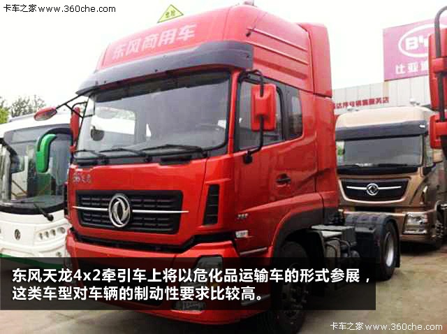 另外東風(fēng)天龍4x2牽引車上安裝有危險(xiǎn)標(biāo)識(shí),可見其將以?;愤\(yùn)輸車的形式參展,這類車型對車輛的制動(dòng)性要求比較高。