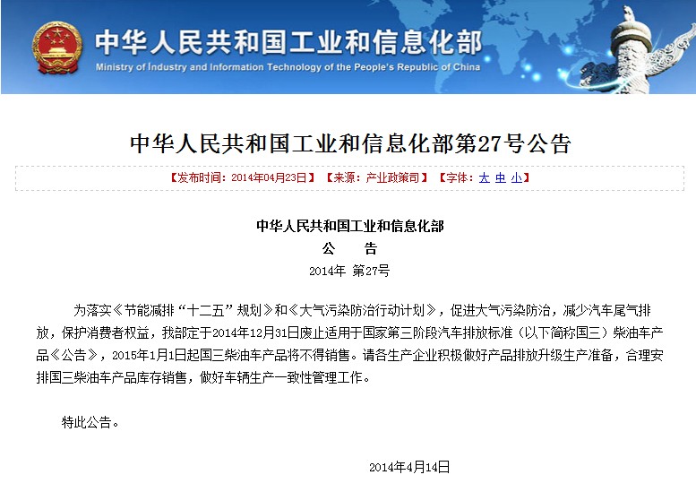 工信部定于2014年12月31日廢止國三柴油車產(chǎn)品公告