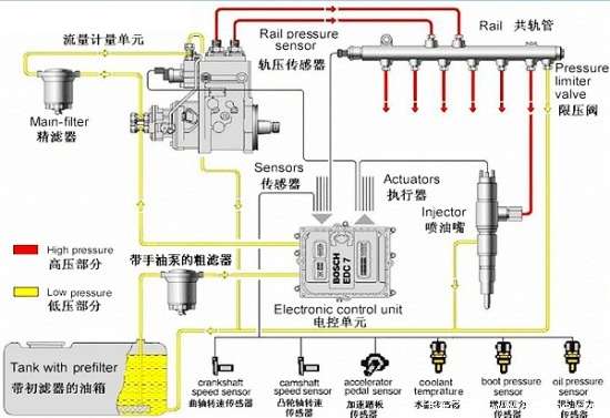 柴油汽車排放污染物的產(chǎn)生原因各異,CO、HC、PM主要是因?yàn)槿紵怀浞謱?dǎo)致,NOx是因?yàn)闅飧兹紵郎囟冗^(guò)高導(dǎo)致,簡(jiǎn)而言之,達(dá)標(biāo)國(guó)IV有四個(gè)要素:一是提高發(fā)動(dòng)機(jī)燃燒效率(高壓共軌),二是提高氧氣利用率(增壓中冷),三是減少?gòu)U棄氮氧化合物含量(EGR系統(tǒng)),四是有針對(duì)性的降低有害氣、固體排放(DOC+POC或者SCR)。