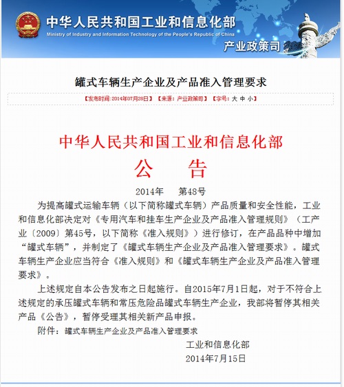 為提高罐式運輸車輛產(chǎn)品質(zhì)量和安全性能,特別是加強對承壓罐式車輛和常壓危險品罐式車輛的管理,減少道路交通安全隱患,工信部7月底發(fā)布公告,對《專用汽車和掛車生產(chǎn)企業(yè)及產(chǎn)品準入管理規(guī)則》(簡稱《準入規(guī)則》)進行修訂,在產(chǎn)品品種中增加罐式車輛,并制定了《罐式車輛生產(chǎn)企業(yè)及產(chǎn)品準入管理要求》(簡稱 《準入管理要求》),提出罐式車輛生產(chǎn)企業(yè)應符合《準入規(guī)則》和《準入管理要求》。