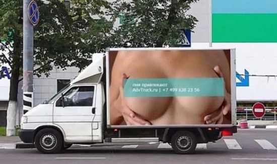 這些撩人的廣告放置在30輛大卡車的兩側(cè),卡車穿街走巷在莫斯科街頭招搖過市,導演了俄羅斯首都街頭一幕幕追尾慘劇。