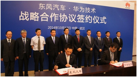 20141017日,東風(fēng)汽車公司與華為技術(shù)有限公司在武漢簽署戰(zhàn)略合作協(xié)議,雙方將在汽車電子、智能汽車、IT/ICT信息化建設(shè)等領(lǐng)域,協(xié)同創(chuàng)新,展開(kāi)跨界合作。這是東風(fēng)主動(dòng)把握移動(dòng)互聯(lián)網(wǎng)的新機(jī)遇,積極開(kāi)展模式創(chuàng)新的重大戰(zhàn)略安排,也是華為拓寬業(yè)務(wù)領(lǐng)域的關(guān)鍵舉措。