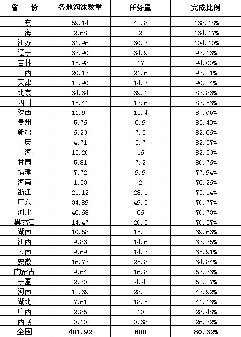 這位負(fù)責(zé)人表示,山東、青海、江蘇3個(gè)省份已提前完成全部淘汰任務(wù),遼寧、吉林、山西、天津、北京、四川、陜西、貴州、新疆、重慶、上海、甘肅等12個(gè)省份已完成任務(wù)總量的80%以上;海南、福建、浙江、廣東、河北、黑龍江、湖南、江西、云南、安徽等10個(gè)省份進(jìn)展較緩慢,完成任務(wù)總量的60%-80%;內(nèi)蒙古、寧夏、河南、湖北、廣西、西藏等6個(gè)省份進(jìn)展嚴(yán)重滯后,尚未完成任務(wù)總量的60%。