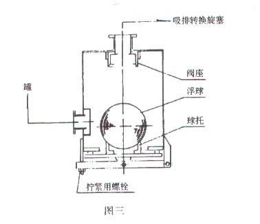 它是萬一當(dāng)罐內(nèi)滿量自動停吸裝置發(fā)生故障時,為防止污水進入泵內(nèi)面自動工作的裝置,雙重保護。吸入油分較多的污泥,則易侵蝕球座和球,故要定期更換。另外,作業(yè)時容易積存污水,所以作業(yè)結(jié)束后一定要排水和清掃浮球,并定期更換浮球。(見圖三)