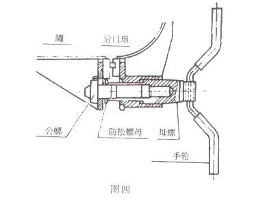 c、將夾緊裝置螺桿,插入罐側(cè)螺孔內(nèi)并轉(zhuǎn)動手把,直至罐門扇壓緊為止