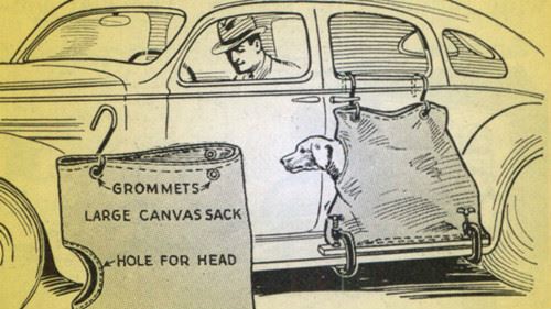 再來看看美國人異(mie)曲(jue)同(ren)工(xing)的一個(gè)發(fā)明,1935年,美國科技雜志《大眾機(jī)械》(Popular Mechanics)發(fā)布了這樣一個(gè)狗袋設(shè)計(jì),并配以這樣的解說:帶著狗開車兜風(fēng)時(shí),又怕它弄臟愛車,就把它放到狗袋里吧,保準(zhǔn)安全又舒服。