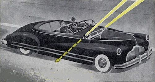 看看這個(gè)1946年出現(xiàn)的發(fā)明,在引擎蓋上安裝一套噴氣裝置,噴氣口朝著斜上方,需緊急剎車時(shí)啟動(dòng),能大大提高制動(dòng)效率。如果是在輪胎制動(dòng)作用不佳的冰雪路面,這種“火箭”剎車器的作用就更明顯。