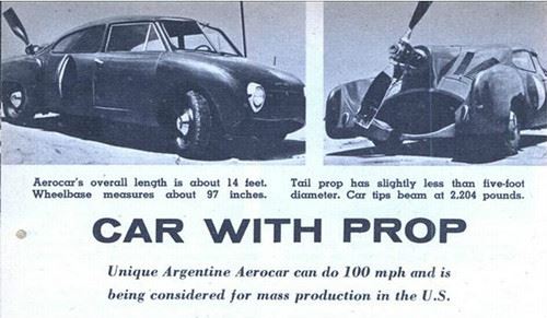 看看這輛誕生于1955年誕生的Argentine Aerocar,從前面看它和普通車型沒多大區(qū)別,但他的尾部卻長了一個(gè)碩大的螺旋槳。資料顯示,這輛車極速高達(dá)100英里/時(shí),相當(dāng)于160公里/時(shí)的速度。