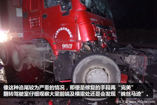 或者翻轉(zhuǎn)駕駛室,觀察發(fā)動機前側(cè)的大梁及橫梁部分。如果是追尾較嚴重的車,大梁前端及駕駛室的損傷會較為嚴重,即便是修復再為“完美”,仔細觀察此處,總會發(fā)現(xiàn)蛛絲馬跡的。成規(guī)模的二手車場人員會較雜,不乏有無良商家,他們的作假技術(shù)都比較專業(yè),挑選車輛一定要瞪大眼睛,不可忽視細節(jié)。