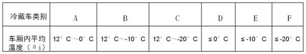 對(duì)于運(yùn)輸易腐食品的冷藏車:當(dāng)環(huán)境溫度為30°C時(shí),按冷藏車車廂內(nèi)平均溫度保持的溫度范圍,分為以下六類: