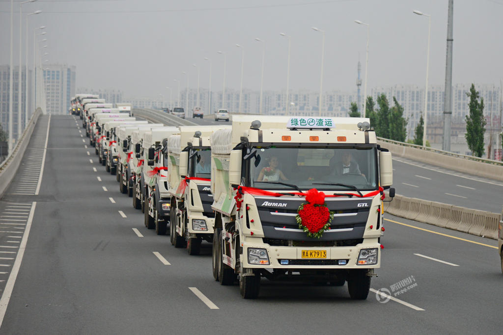 6月27日,哈爾濱市松北區(qū)新新怡園小區(qū)門前,36輛嶄新的綠色環(huán)保渣土車在路邊依次排開,每輛車車頭上都貼著大大的紅喜字,周圍扎滿了鮮花和氣球,浩浩蕩蕩的渣土車組成的接親車隊吸引了過往市民的目光。據(jù)新郎介紹,自己從事土方運輸生意,36輛嶄新的渣土車也是新買的,因為今天同樣也是公司開業(yè)的第一天,為了雙喜臨門的好兆頭,干脆就用新買的渣土車來接新娘。說起結(jié)婚形式的獨特,新郎表示,“與媳婦談戀愛時就一直考慮結(jié)婚的形式,為了給她一個終生難忘的婚禮,經(jīng)過深思熟慮后,就決定要用自家的渣土車作為接親的車輛。而這一切,都是悄悄為妻子準(zhǔn)備的,只為了給她一個驚喜。