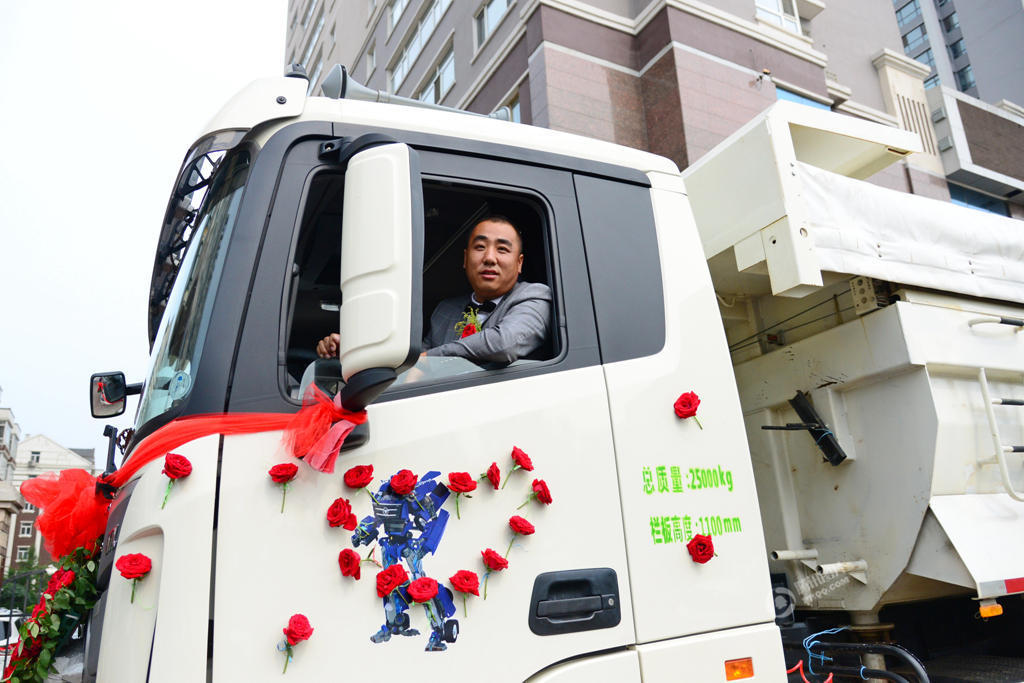 對于用心準(zhǔn)備的新郎,新娘表示,“其實我并不在乎婚禮有豪車或者辦得有多拉風(fēng),但我能感覺得到他的用心,所以我也十分支持他,而我也特別喜歡這種與眾不同的感覺,這真的是一場讓我終身難忘的婚禮!”6月27日,哈爾濱,新郎開著渣土車來接親。