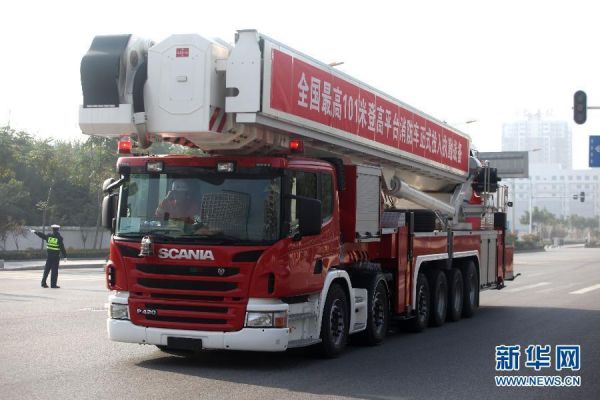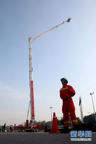 11月2日,101米消防登高車在武漢舉行的高層建筑滅火救援演練中亮相?! ‘?dāng)日,湖北省公安消防部隊(duì)在武漢舉行高層建筑跨區(qū)域滅火救援演練,武漢消防的一輛101米消防登高車在演習(xí)中首次亮相。該登高車最大升限為101米,主要應(yīng)對69米至101米高層建筑火災(zāi)撲救,加上水泵的壓力后,最大噴射高度能達(dá)到150米左右,約50層樓高,可在高層建筑的滅火與搶險救援中發(fā)揮重要的作用?! ⌒氯A社發(fā)