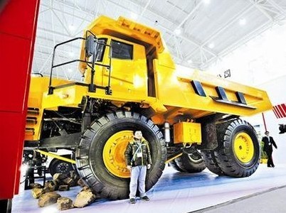電影《變形金剛》中,霸天虎陣營(yíng)中有一個(gè)巨無霸機(jī)器人“大力神”,由于身形龐大,讓汽車人頗為頭疼。昨日車展現(xiàn)場(chǎng),一個(gè)尚未“變形”的大力神則讓現(xiàn)場(chǎng)觀眾狂呼過癮。這是由東風(fēng)(十堰)特種商用車有限公司打造的一款亮黃色的礦用自卸車?!皢慰催@個(gè)輪子都比我個(gè)頭要高?!编嵪壬砀?.85米,參加工作前曾在學(xué)校?;@球隊(duì)擔(dān)任主力,但當(dāng)他站到自卸車旁邊時(shí),卻連聲嘆氣說自己矮了?!败嚫?.5米,車輪直徑有1.9米?!睎|風(fēng)特種商用車公司主管工程師彭飛介紹,該車最大載重50噸,百公里油耗估計(jì)有90升。主要用于礦區(qū)作業(yè),市場(chǎng)售價(jià)約在250萬以上。