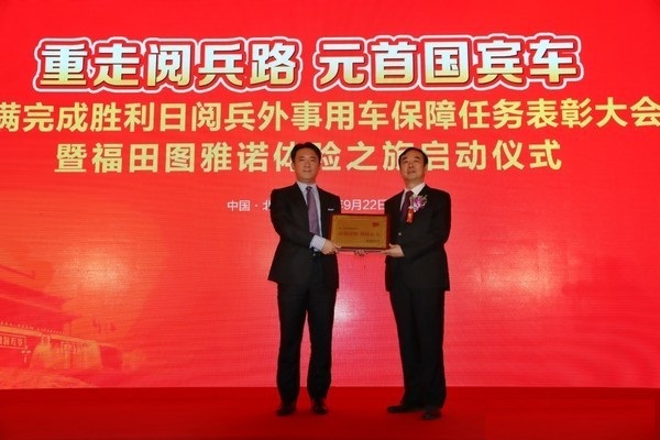 9月22日,北京人民大會(huì)堂盛大舉行了勝利日閱兵外事使用車保障任務(wù)表彰大會(huì),北京市人民政府對(duì)勝利日閱兵期間做出突出貢獻(xiàn)的福田汽車集團(tuán)進(jìn)行表彰,向福田汽車集團(tuán)頒發(fā)了“品質(zhì)過(guò)硬 保障有力”的榮譽(yù)稱號(hào)。