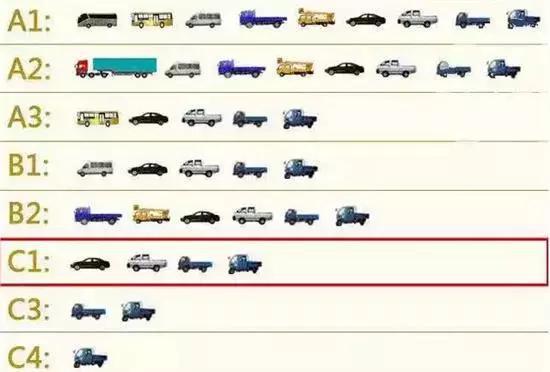 除了上面這個(gè)范疇,C1駕駛證還可以開C2、C3、C4的準(zhǔn)駕車型。