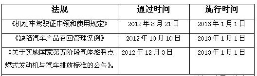 馬上就是2013年了,新的一年很多和汽車相關(guān)的道路交通和管理法規(guī)都將開始生效。大家耳熟能詳?shù)氖切碌摹稒C(jī)動(dòng)車駕駛證申領(lǐng)和使用規(guī)定》,但是除了“新交規(guī)”,還有“國(guó)V標(biāo)準(zhǔn)”“首部召回制度”的正式實(shí)施都已經(jīng)進(jìn)入了倒計(jì)時(shí)。廠商、開車族們的功課是否已經(jīng)做好?各類規(guī)則的調(diào)整,是否已經(jīng)了然于胸?下面,湖北俊龍專用汽車有限公司的編輯就為您盤點(diǎn)一下2013年元旦起將實(shí)施的汽車法規(guī)。