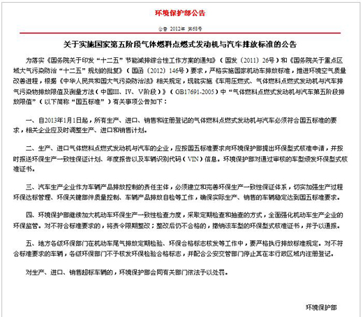 2012年12月3日,環(huán)保部發(fā)布《關(guān)于實(shí)施國(guó)家第五階段氣體燃料點(diǎn)燃式發(fā)動(dòng)機(jī)與汽車排放標(biāo)準(zhǔn)的公告》。公告稱,為嚴(yán)格實(shí)施國(guó)家機(jī)動(dòng)車排放標(biāo)準(zhǔn),推進(jìn)環(huán)境空氣質(zhì)量改善進(jìn)程,規(guī)定要求自2013年1月1日起,所有生產(chǎn)、進(jìn)口、銷售和注冊(cè)登記的天然氣發(fā)動(dòng)機(jī)與汽車必須符合國(guó)五排放標(biāo)準(zhǔn)。