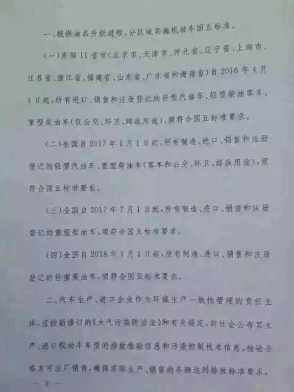 (一)東部11省市(北京市、天津市、河北省、遼寧省、上海市、江蘇省、浙江省、福建省、山東省、廣東省和海南?。┳?016年4月1日起,所有進(jìn)口、銷(xiāo)售和注冊(cè)登記的輕型汽油車(chē)、輕型柴油客車(chē)、重型柴油車(chē)(僅公交、環(huán)衛(wèi)、郵政用途),須符合國(guó)五標(biāo)準(zhǔn)要求。