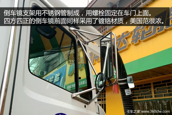 看起來有些略微復(fù)雜的倒車鏡支架用不銹鋼管制成,通過螺栓固定在車門上面,三角結(jié)構(gòu)可以讓倒車鏡的震動(dòng)更小。四方四正的倒車鏡前面同樣采用了鍍鉻材質(zhì),這樣符合美國(guó)人的審美習(xí)慣。不知道后視鏡下方的凸面鏡是不是進(jìn)入國(guó)內(nèi)之后進(jìn)行了改裝,看起來和后視鏡有些重疊,車輛前方的補(bǔ)盲鏡被裝在了吸污管上面。
