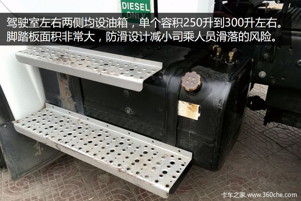駕駛室左右兩側(cè)的下方均為油箱,目測(cè)單個(gè)容積大概在250升到300升左右,很奇怪油箱蓋上面為什么沒有加鎖,難道美國(guó)那邊沒有油耗子的嗎?油箱的上下端裝了鍍鋅鋼板做成的腳踏板,面積非常的寬大,加上防滑設(shè)計(jì),司乘人員上下車意外滑落的情況應(yīng)該會(huì)極少發(fā)生。