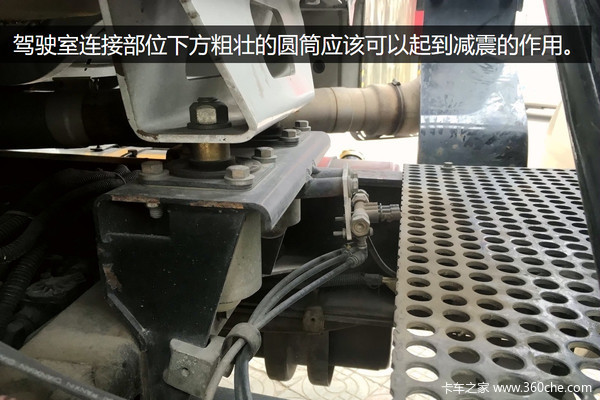 駕駛室后方的懸架裝置比較有意思,看上去好像是用硬連接的方式固定在支架上面。但通過仔細(xì)的觀察應(yīng)該不是這么簡(jiǎn)單,猜測(cè)連接部位下方粗壯的圓筒應(yīng)該可以起到減震的作用,有對(duì)這樣設(shè)計(jì)比較熟悉的朋友可以在文章下面跟帖給我們普及一下。