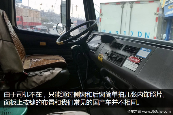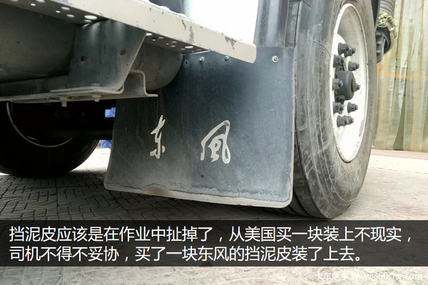 其中又一邊前輪上的擋泥皮應(yīng)該是在作業(yè)的過程當(dāng)中扯掉了,從大洋彼岸的美國(guó)買一塊過來裝上去不太現(xiàn)實(shí),司機(jī)不得不妥協(xié),買了一塊東風(fēng)的擋泥皮裝了上去。