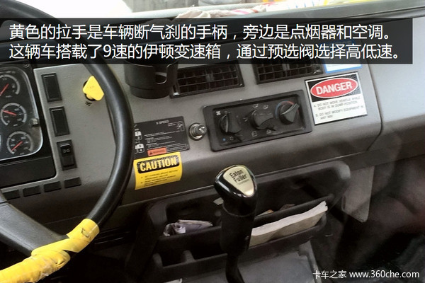 方向盤右邊的面板上按鍵就相對(duì)來說比較簡(jiǎn)單,黃色的應(yīng)該是斷氣剎的操作拉手,旁邊是點(diǎn)煙器和空調(diào)的旋鈕開關(guān)。黑色的貼紙上面可以看出這輛車搭載了9速的伊頓變速箱,并通過預(yù)選閥進(jìn)行換擋操作。