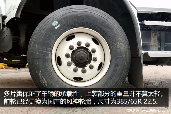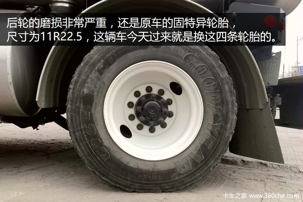 多片簧的懸掛保證了車輛的承載性。導(dǎo)向輪原裝輪胎已經(jīng)更換為國(guó)產(chǎn)385/65R 22.5風(fēng)神大寬胎,驅(qū)動(dòng)輪上面則采用了固特異11R22.5輪胎,后胎的磨損已經(jīng)非常嚴(yán)重,這臺(tái)車今天過來就是來更換這四條輪胎的。