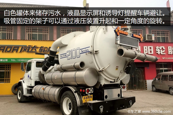 上裝可以分為兩個(gè)部分來說,其中巨大的白色罐體和垂在車輛前面的軟管主要用途是將污水或者雜物吸出來暫時(shí)儲(chǔ)存在罐體內(nèi)運(yùn)輸?shù)絼e處進(jìn)行傾倒。白色的罐體作為污水的容器后方的蓋子可以打開,并且可以像自卸車斗一樣升起好將管內(nèi)的污水排出。