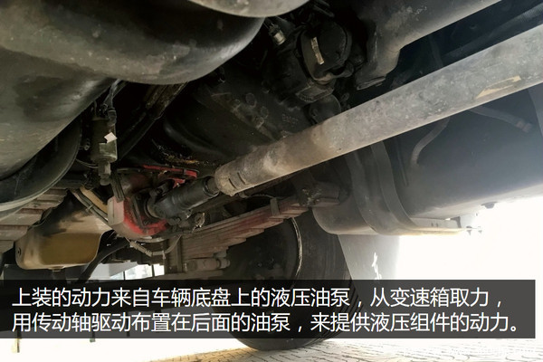 上裝部分的動(dòng)力來自車輛底盤上的液壓油泵,從變速箱的并聯(lián)接口取力,用傳動(dòng)軸直接驅(qū)動(dòng)布置在后面的油泵,來提供液壓組件的動(dòng)力。