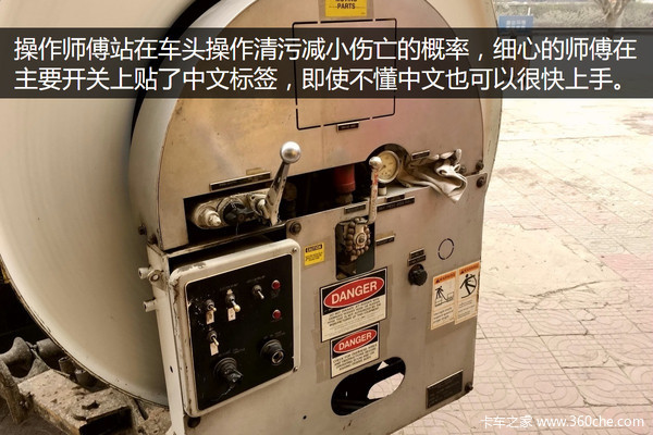 清污車操作員的位置設(shè)置在車輛的前方,能夠避免追尾等肇事造成的意外傷亡事故。布置在車頭的裝置可以控制清污軟管的收放以及沖洗水壓的調(diào)節(jié),這套裝備最大可以提供2000PSI的水壓(換算為13.8Mpa),細(xì)心的操作師傅在主要的開關(guān)上面貼了中文的標(biāo)簽,好讓不熟悉的人一看到就可以進(jìn)行操作。其中一個(gè)扳手上面掛了一串手串,不知道是不是清污的時(shí)候清理出來的,看起來好復(fù)古的樣子。