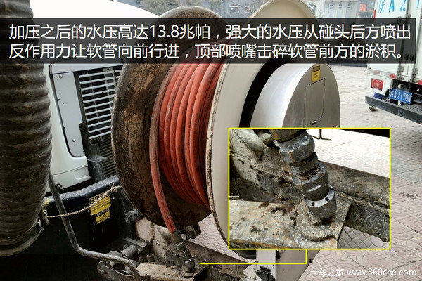 吸管固定的架子可以通過液壓裝置升起和一定角度的旋轉(zhuǎn),好將吸管放入作業(yè)的污水井內(nèi)進(jìn)行吸污,車上固定鐵管則可以用卡子裝在軟管的前端,以延長(zhǎng)吸污的深度。