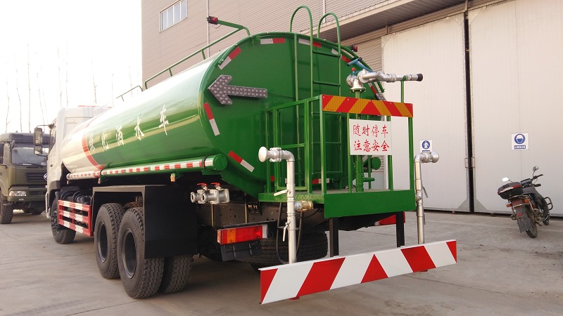 灑水車最重要的莫過于后面裝水的罐體,這款東風天龍灑水車的整車和罐體外形尺寸為(mm)10200/2500/3300,6800×2390×1620。有效容積為17.59立方米,為了負荷這么長這么重的罐體,后面配備了八個輪胎,所以這款灑水車也叫“天龍后八輪灑水車”。