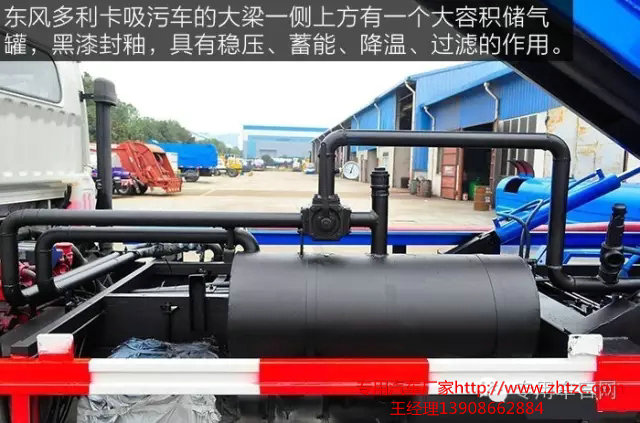東風(fēng)多利卡吸污車的大梁一側(cè)上方有一個(gè)大容積儲(chǔ)氣罐,黑漆封釉,具有穩(wěn)壓、蓄能、降溫、過濾的作用。