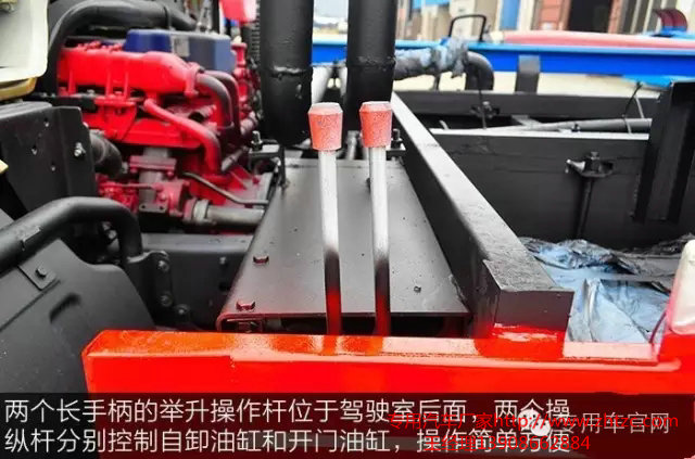 兩個(gè)長手柄的舉升操作桿位于駕駛室后面,兩個(gè)操縱桿分別控制自卸油缸和開門油缸,操作簡單方便。