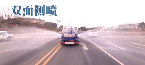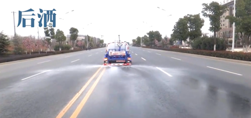 灑水車前沖(我們經(jīng)??吹綖⑺嚊_洗路面是從車前端下部,兩個(gè)噴頭對(duì)沖噴出高壓水柱,高壓水柱效果可以對(duì)沖三個(gè)車道左右)