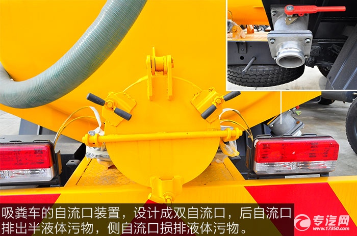 吸糞車的自流口裝置,設(shè)計成雙自流口,后自流口排出半液體污物,側(cè)自流口損排液體污物,使排污方式更加靈活起來。