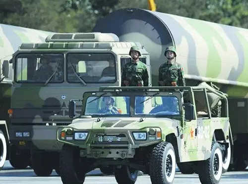 ▲東風“猛士”引領東風-31甲戰(zhàn)略核導彈通過天安門