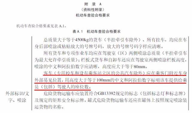《機(jī)動(dòng)車運(yùn)行安全技術(shù)條件》規(guī)定:所有客車(專用校車和設(shè)有乘客站立區(qū)的公共汽車除外)應(yīng)在乘客門附近車身外部易見位置,用高度大于等于100mm的中文及阿拉伯?dāng)?shù)字標(biāo)明該車提供給乘員(包括駕駛?cè)?的座位數(shù)。
