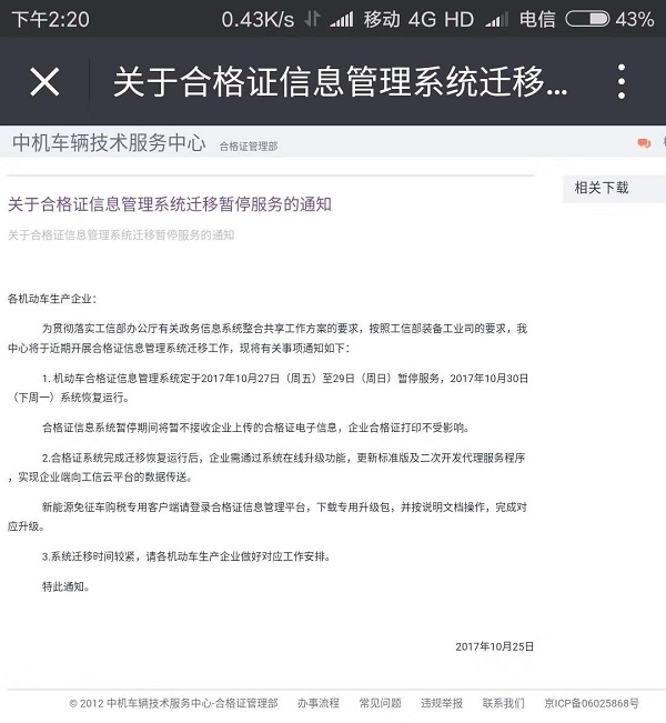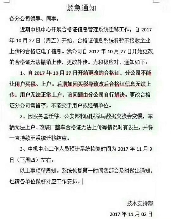 10月25日國家車輛合格證管理機構(gòu)-中機中心發(fā)布通知系統(tǒng)升級。預計在11月9日完成系統(tǒng)升級,此期間車輛無法上戶、改裝廠整車合格證無法上傳等情況會時有發(fā)生。