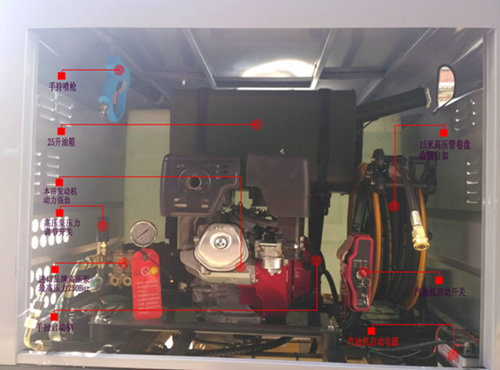 清洗泵單元:本田發(fā)動機配備德國水泵。發(fā)動機采用電子打火,加裝25升大容量油箱。水泵輸出250公斤壓力,清潔能力強。