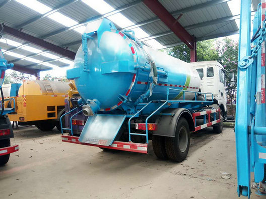 吸污車專用部分由取力器、傳動軸、真空吸污泵、壓力罐體、液壓部分,管網(wǎng)系統(tǒng)、真空壓力表、視糞窗、洗手裝置等組成,隨車配置大功率真空吸污泵和優(yōu)質(zhì)液壓系統(tǒng),罐體封頭一次壓鑄成型、罐體可后開、雙頂自卸。罐內(nèi)污物可通過后蓋直接傾倒,具有真空度高(比吸糞車的吸力更大)、噸位大、效率高、用途更廣泛的特點。