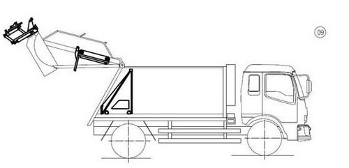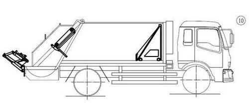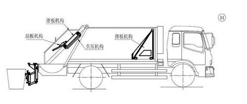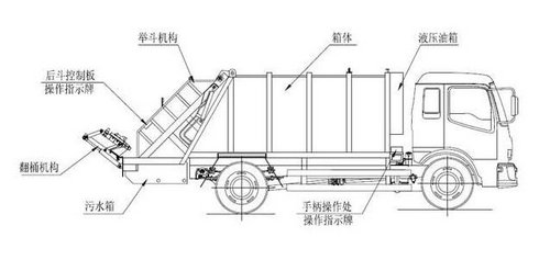 在眾多垃圾車車型中,壓縮垃圾車車型結(jié)構(gòu)最為復(fù)雜。其工作過程除了普通垃圾車具備的垃圾裝卸功能外,在垃圾裝運(yùn)的同時(shí)利用舉升及液壓裝置完成垃圾的壓縮過程。以下是垃圾車工程部提供給我們的壓縮式垃圾車結(jié)構(gòu)示意圖: