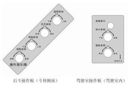 3.旋轉(zhuǎn)翻桶操作旋鈕至左下翻位置,垃圾桶回置,松開旋鈕回中位;然后旋轉(zhuǎn)滑板操作旋鈕至左下滑位置,滑板下滑(注意:刮板在向上收的位置),松開旋鈕回中位,準(zhǔn)備收刮垃圾;如圖: