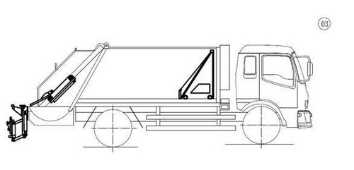 10.旋轉(zhuǎn)推板操作旋鈕至左收回位置,推板被收回,松開旋鈕;再旋轉(zhuǎn)舉斗操作旋鈕至左下落位置,斗體放下并與車箱鎖緊,松開旋鈕,同時(shí)松開取力器(若翻桶機(jī)構(gòu)為放下位置,請(qǐng)將其翻上),此時(shí)壓縮式垃圾車整車可移動(dòng)。整車移動(dòng)時(shí)各機(jī)構(gòu)位置如圖所示