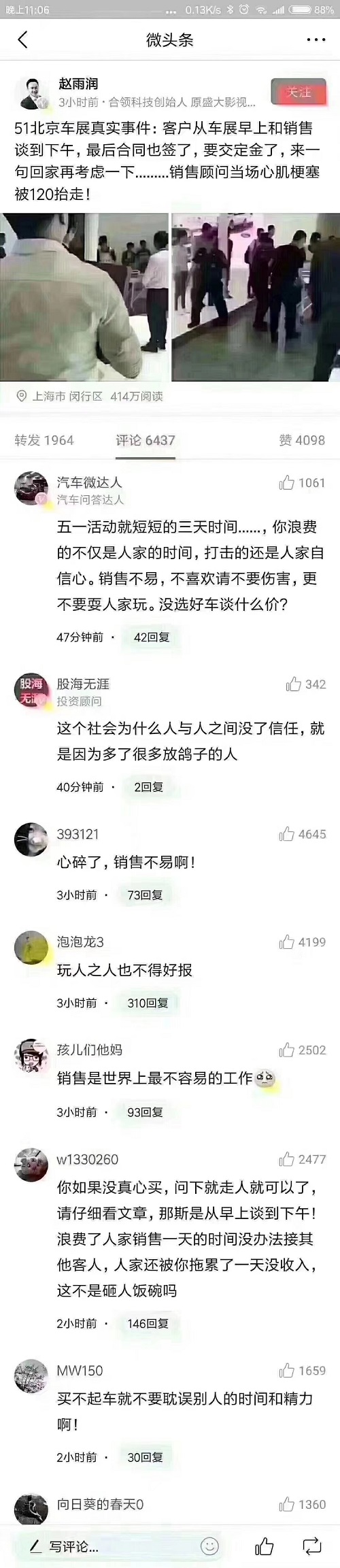 不少自稱汽車銷售人員的網(wǎng)友在微博評論下留下怨言,聲稱賣車不容易,賣車賣到懷疑人生。